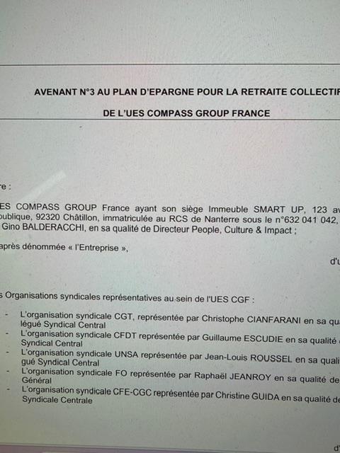 Entre : L’UES COMPASS GROUP France ayant son siège Immeuble SMART UP, 123 avenue de la République, 92320 Châtillon, immatriculée au RCS de Nanterre sous le n°632 041 042, représentée par Gino BALDERACCHI, en sa qualité de Directeur People, Culture & Impact ; Ci-après dénommée « l’Entreprise », ET Les Organisations syndicales représentatives au sein de l'UES CGF : - d'une part, L’organisation syndicale CGT, représentée par Christophe CIANFARANI en sa qualité de Dé légué Syndical Central - - - - L’organisation syndicale CFDT représentée par Guillaume ESCUDIE en sa qualité de Délégué Syndical Central L’organisation syndicale UNSA représentée par Jean-Louis ROUSSEL en sa qualité de Délé gué Syndical Central L’organisation syndicale FO représentée par Raphaël JEANROY en sa qualité de Secrétaire Général L’organisation syndicale CFE-CGC représentée par Christine GUIDA en sa qualité de Déléguée Syndicale Centrale d'autre part, Il est décidé de réaliser un avenant au Plan d’épargne pour la retraite collective initial signé le 28 février 2012, ci-après nommé « le PERECO ». Dans le but de rajouter la Prime de Partage de la Valeur ou « PPV » comme flux d’alimentation possible pour les collaborateurs afin de pouvoir l’épargner sur les supports de placement disponibles au sein du PERECO. L’article 3 est complété comme suit : Article 3 - ALIMENTATION DU PLAN - Versement de la Prime de Partage de la Valeur, dit « PPV » Les sommes attribuées au titre de la PPV et affectées au PERECO doivent être versées dans un délai maximum de 15 jours à compter de leur date de paiement pour bénéficier de l’exonération fiscale qui lui est attachée. Page 1 sur 5 En cas d’absence de choix exprimé par le collaborateur, selon la loi en vigueur, le paiement de cette prime sera réalisé par défaut sur le compte bancaire du bénéficiaire. L’article 4 est complété comme suit : Article 4 – MODALITES DE GESTION Les sommes versées au PERECO par les Bénéficiaires ou par l'Entreprise sont, dans un délai de quinze jours à compter de leur versement par le Bénéficiaire ou de la date à laquelle elles sont dues par l’Entreprise, employées à l'acquisition de parts de FCPE. Les critères de choix retenus pour déterminer les formules de placement ont consisté dans l’analyse du couple rendement/risque, du potentiel de performance, de la politique d’investissement et du type d’actifs détenus par les FCPE. Les sommes versées au PERECO peuvent, selon le choix du Bénéficiaire, être investies dans plusieurs modes de gestion : « Gestion pilotée » et/ou « Gestion libre » définies ci-après. Option de gestion par défaut du PERECO : la Gestion Pilotée profil « équilibre » Par défaut, les versements du Bénéficiaire sont affectés dans une grille (profil d’investissement) de Gestion Pilotée. Il est proposé au moins une allocation d’actifs correspondant à un profil d’investissement différent, notamment une allocation permettant l’acquisition de parts de fonds solidaires et, depuis le 1er/07/2024 (tolérance administrative jusqu’au 31/12/2024 pour s’y conformer) d’au moins un fonds d’épargne verte ou socialement responsable relevant de labels listés à l’article 3 du décret n°2024-644 du 29 juin 2024] A défaut d’indication de choix d’option dûment exprimé par le Bénéficiaire sur le mode de gestion et/ou les différents FCPE, les sommes versées dans le PERECO sont affectées en Gestion Pilotée selon la grille correspondant au profil « équilibre ». Sauf information expresse différente du Bénéficiaire, la date d’échéance du PERECO retenue correspond à l’âge légal de départ à la retraite au moment du versement. Cette date peut être modifiée à tout moment par le Bénéficiaire. Gestion pilotée La Gestion Pilotée est une technique d’allocation d’actifs automatisée entre plusieurs supports de placement, en fonction d’un profil d’évolution d’allocation et d’un horizon de placement choisis par le Bénéficiaire. Elle garantit une diminution progressive de la part des actifs à risque élevé ou intermédiaire et une augmentation progressive de la part des actifs présentant un profil d'investissement à faible risque, à mesure que l’horizon de placement du Bénéficiaire approche. Le rythme minimal de sécurisation et la nature des actifs présentant un profil d'investissement à faible risque sont précisés par un arrêté du 7 août 2019 portant application de la réforme de l’épargne retraite. Par ce moyen, le Bénéficiaire donne l’ordre au Gestionnaire d’effectuer, selon une fréquence définie, les arbitrages de placement entre plusieurs FCPE, pour son compte, conformément à l’horizon de placement qu’il aura préalablement défini et selon les modalités de la grille d’allocation d’actifs définie Gestion libre Le Bénéficiaire répartit librement son versement entre les FCPE proposés. Son choix doit être précisé lors de chaque versement et à défaut de choix explicite, l’option de gestion par défaut s’applique. Dans le cadre de la « Gestion Libre », les sommes recueillies par le PERECO sont employées, au choix des Bénéficiaires, à l'acquisition de parts des FCPE suivants : Page 2 sur 5 - - - - AMUNDI LABEL MONETAIRE ESR-F AMUNDI PROTECT 90 ESR – F AMUNDI LABEL EQUILIBRE SOLIDAIRE ESR-F AMUNDI OPPORTUNITES ESR – F gérés par la Société de gestion Amundi Asset Management, société par actions simplifiée (SAS) ayant son siège social 91-93 boulevard Pasteur, 75015 Paris. Le Dépositaire étant CACEIS Bank, société anonyme ayant son siège social 89-91 rue Gabriel Péri, 92120 Montrouge. Modification du choix de placement ou du choix de gestion ou d’échéance À tout moment les Bénéficiaires ont la possibilité de modifier : - dans le cadre de la Gestion Libre, l’affectation de tout ou par